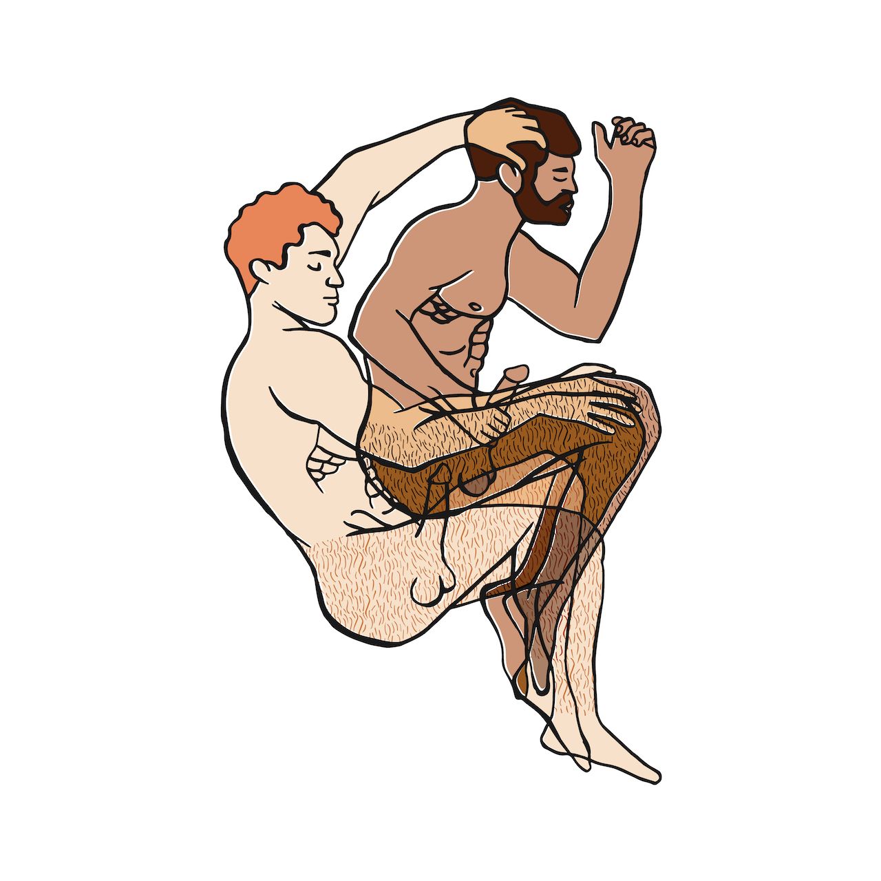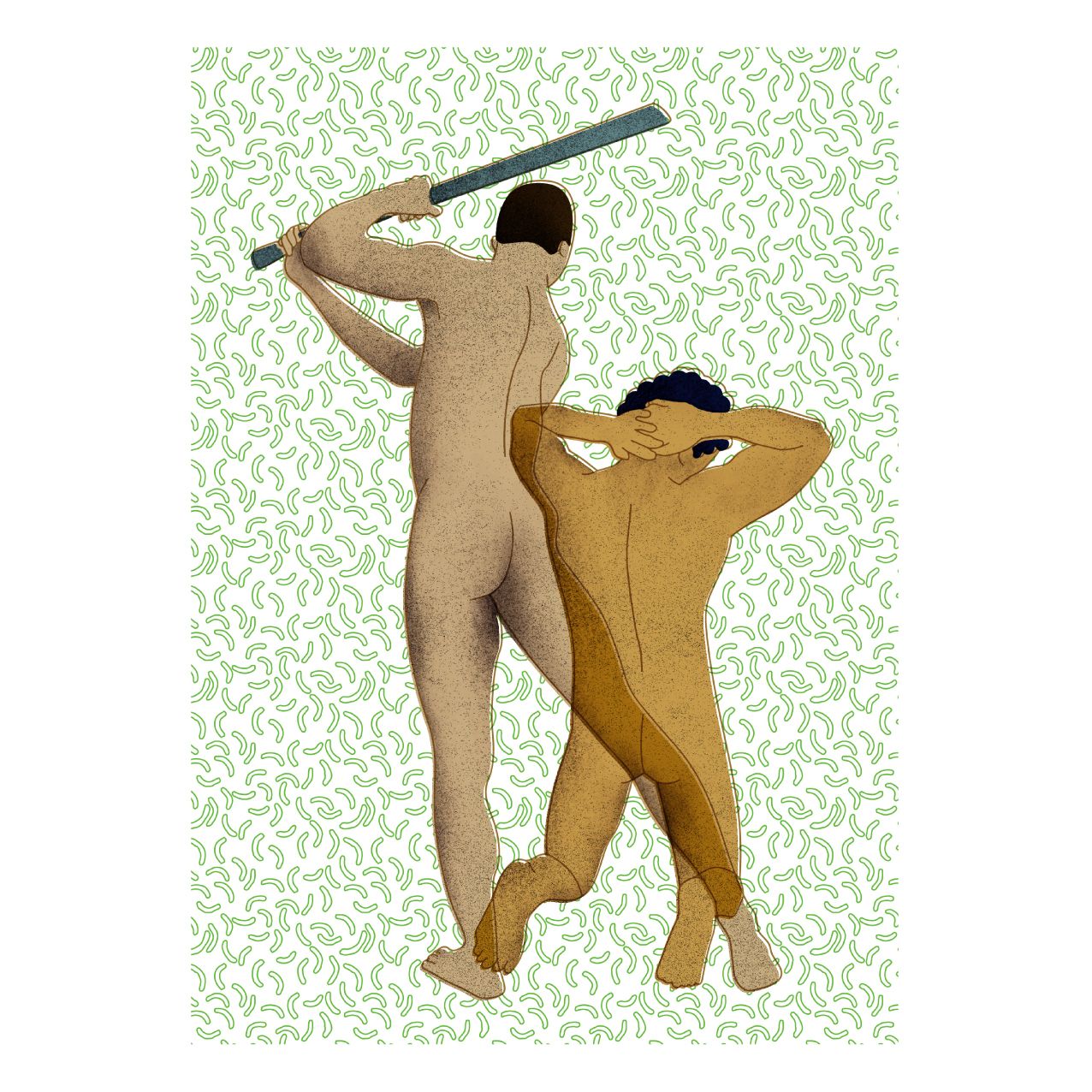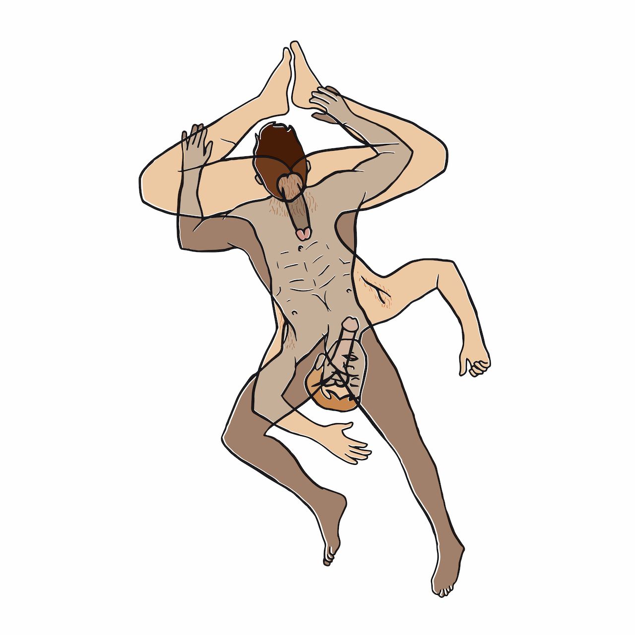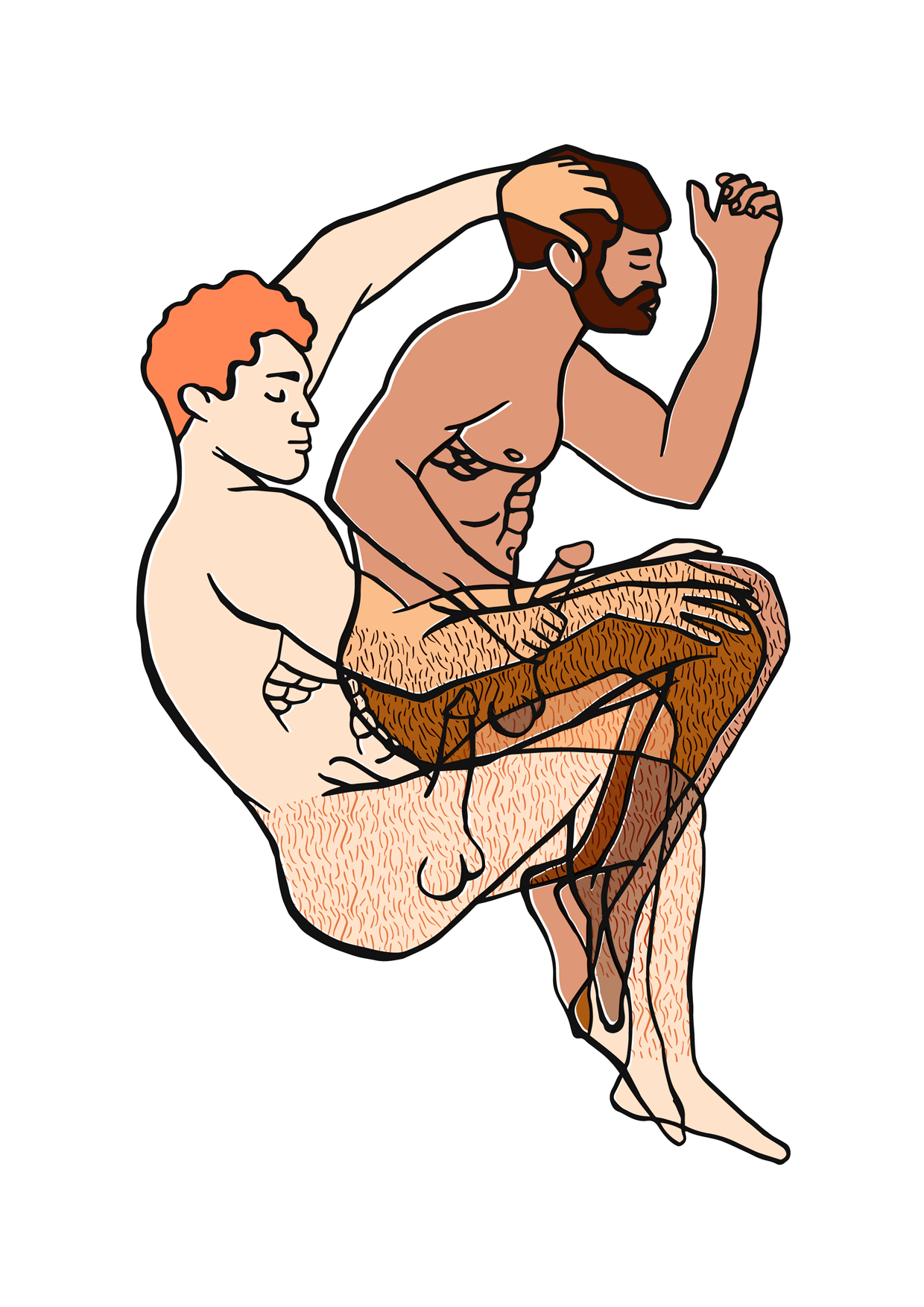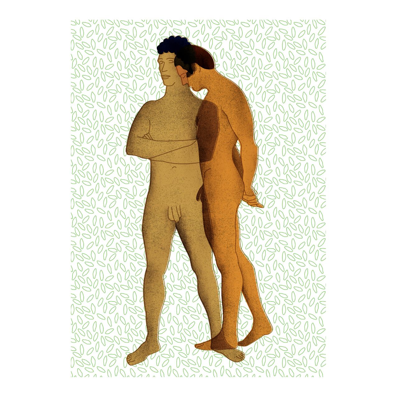 Figures of sleeping naked men overlap to interact erotically with each other.