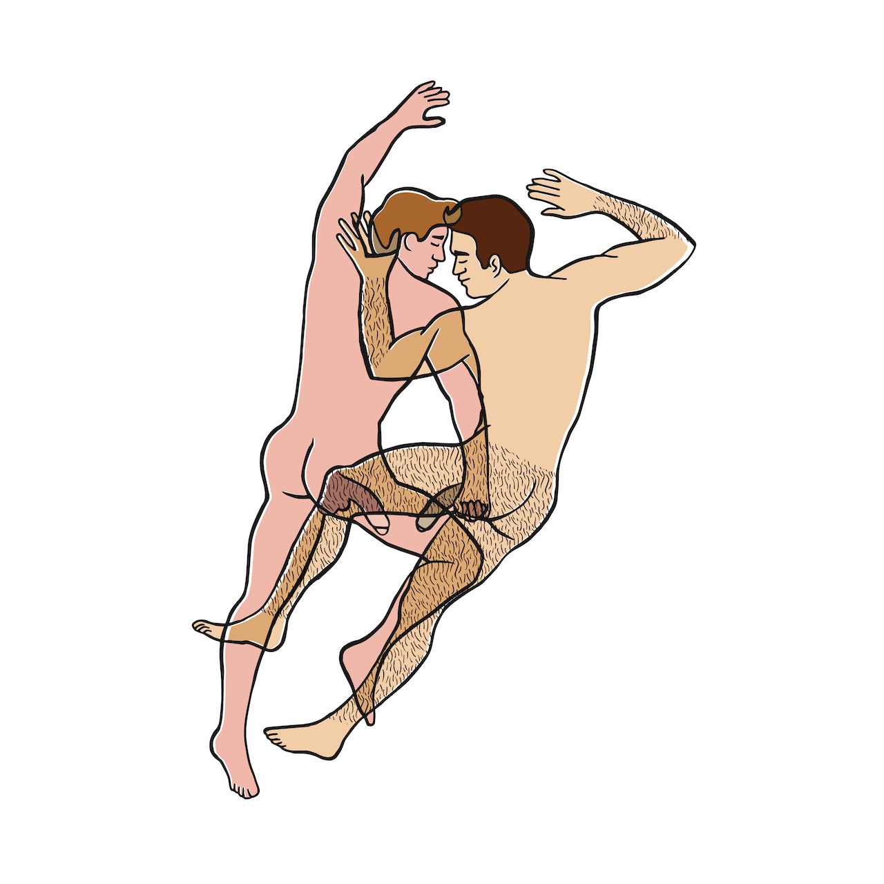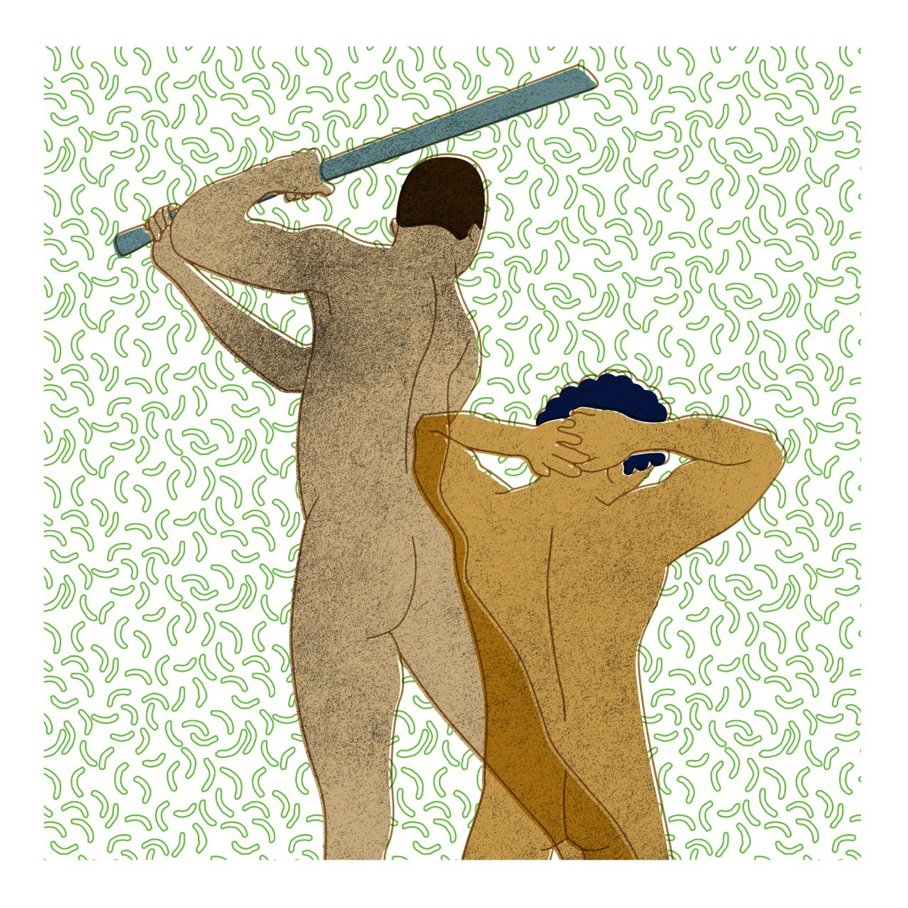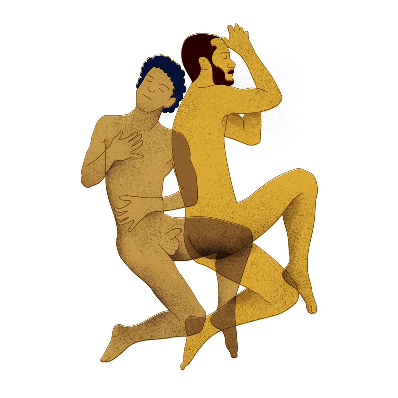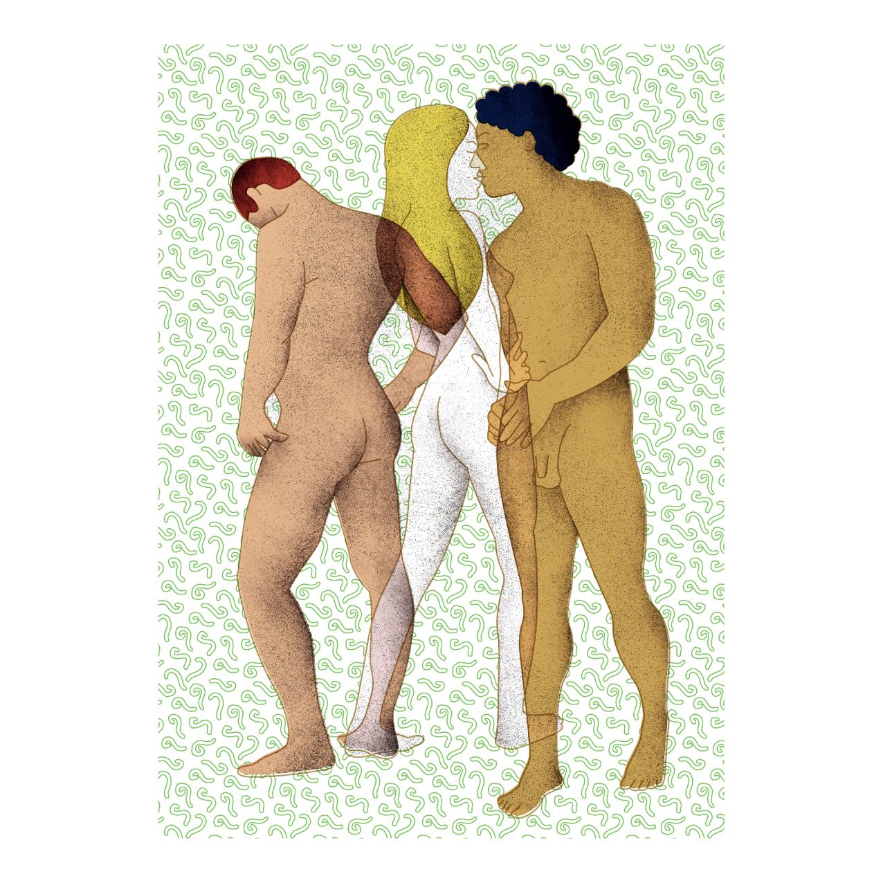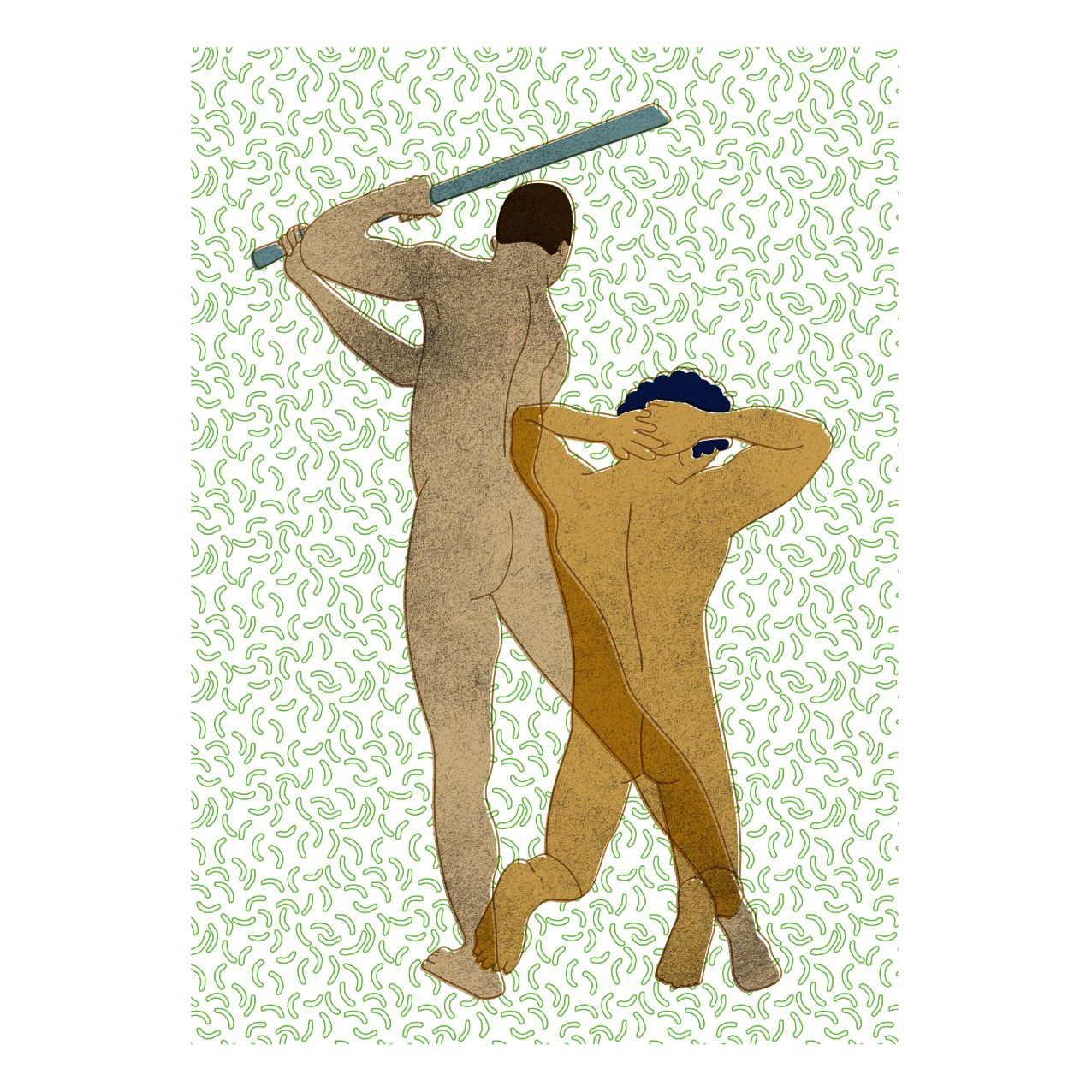 Figures of sleeping naked men overlap to interact erotically with each other.